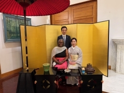 On 26th February 2026, the National Day Reception of Japan was held at the Ambassador's Residence to celebrate the birthday of His Majesty the Emperor of Japan. Many guests from various sectors, including the national and local government, the diplomatic corps and international organisations based in Lusaka, as well as the business, education, arts and sports communities joined this celebration. The ceremony opened with local vocalist Ms. Becky Chanteuse performing the national anthems of Japan and Zambia.